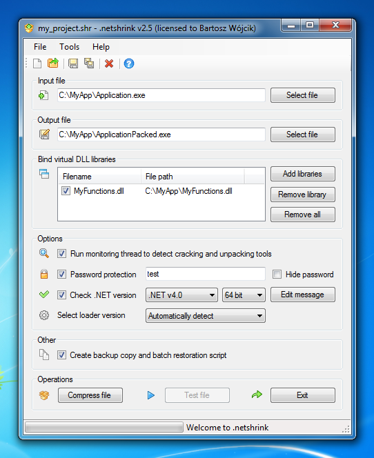 .netshrink allows you to specify a directory for saving, add multiple DLL items to the list, delete selected DLL files or clear the entire workspace, encrypt data with passwords, and check the current version of the .NET Framework.