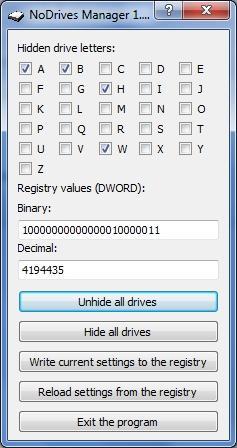 NoDrives Manager is a simple tool for hiding Windows logical drives by editing the registry. Hidden drives are still available, but they are not visible in Windows Explorer.
