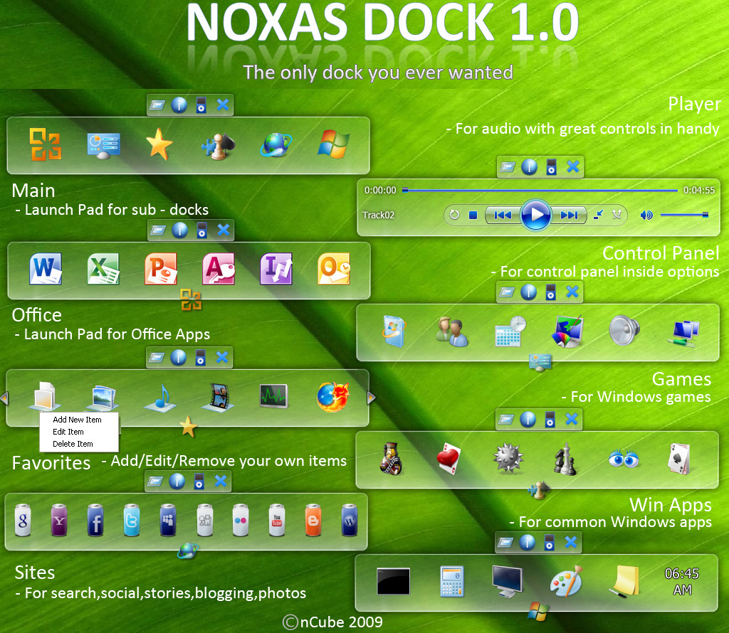 Noxas Dock is a utility for organizing and launching applications. It is divided into eight categories so you can easily find what you are looking for. The categories are: