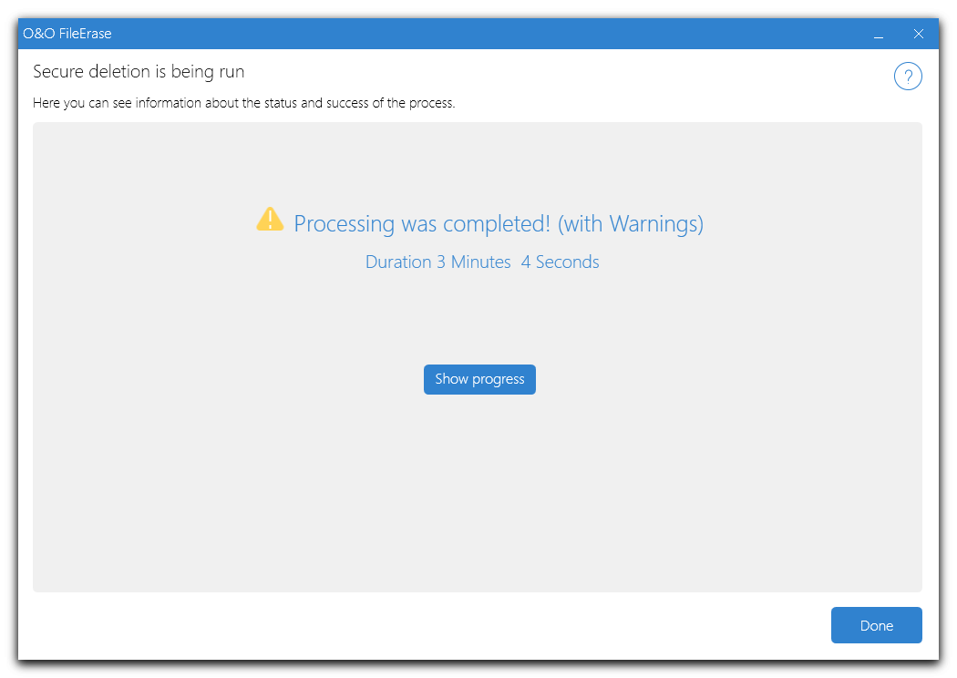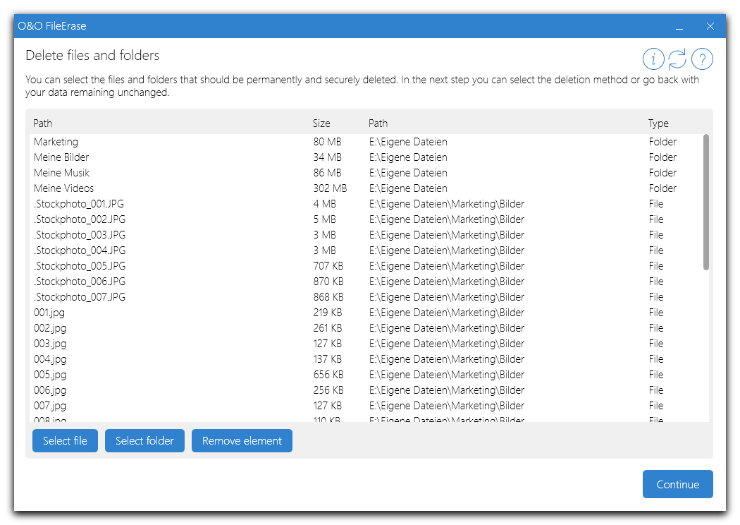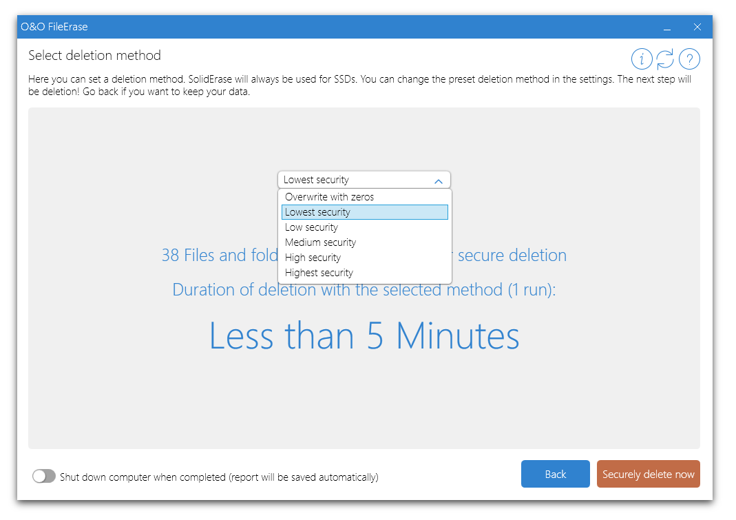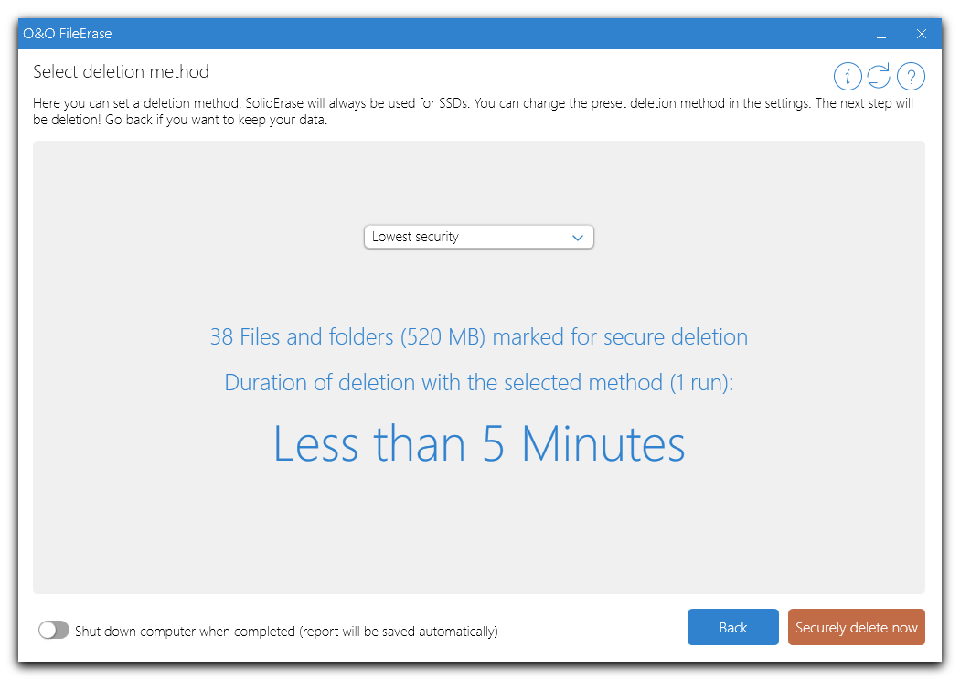 O&O FileErase destroys files and folders at the touch of a button. You can decide for yourself with what level of security your data should be destroyed. It allows full control over which files or folders O&O FileErase should delete for you.