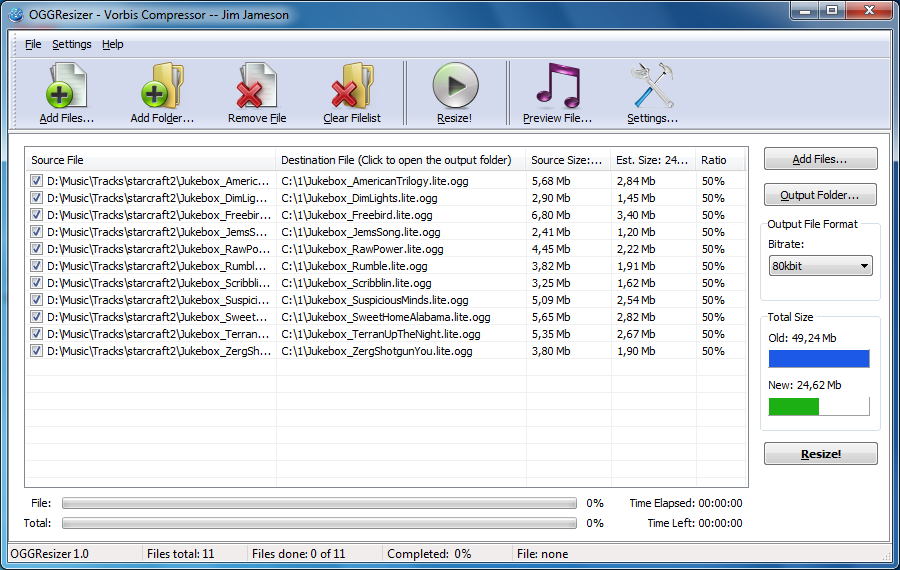 OGGResizer helps you to reduce the size of any Ogg Vorbis file by simply recompressing the track with a lower bitrate.
