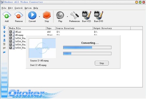 Okoker All Video Converter&Burner Pro is a professional conversion tool that allows you to bulk convert almost all video files to MPEG, AVI, WMV, DVD, VCD, SVCD and then burn them to DVD, CD media. You can set the output file size and codec system (PAL or NTSC).