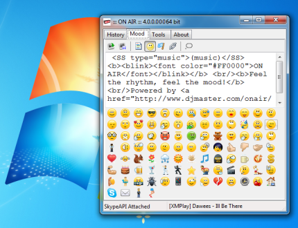 ON AIR is a plug-in for Skype. It displays the currently playing audio track as a status message (mood message or status message) on the user profile. The tool displays the currently playing song on the system tray in the notification area.