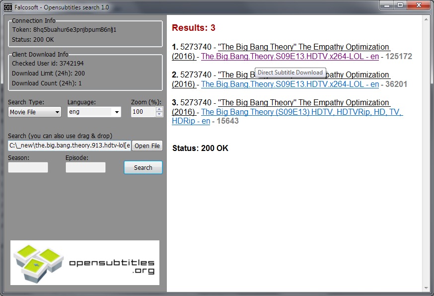 Opensubtitles Search is a small portable search client for the Opensubtitles server that searches and downloads movie subtitles. Just select the title of the movie or series. Of course, you can add the language of the subtitles (e.g. English, Czech) and also zoom, or enlarge the subtitles in the dedicated space. You can also add the video file itself to the subtitles, which is stored on the local disk.