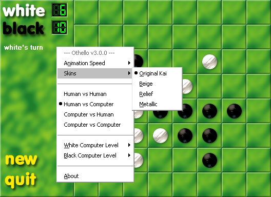 Othello is a digital reworking of the classic board game. The board is 8x8 squares and the goal is to get as many opposing stones as possible. The winner is the player who has more of their stones after filling the board. The game has 3 levels of play: beginner, advanced and professional. The game is nicely graphically designed.
