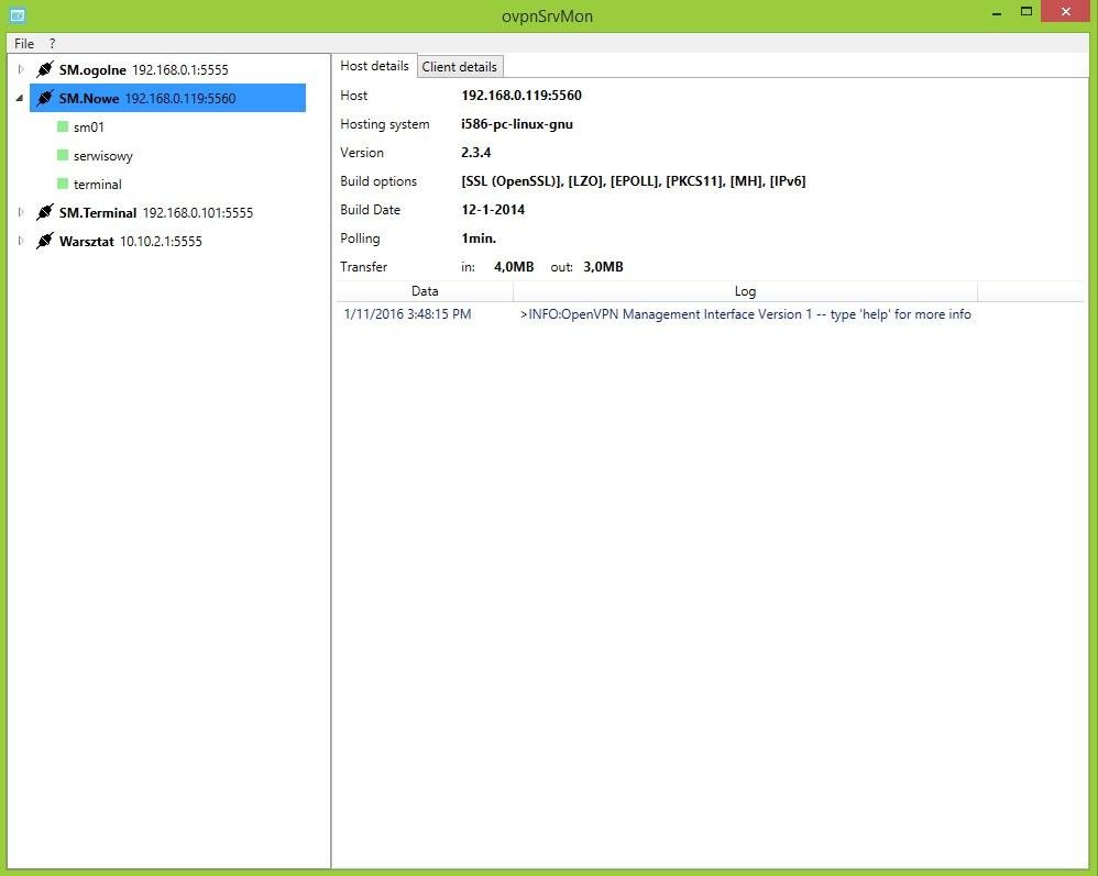 ovpnSrvMon monitors the OpenVPN connection instance. The software is built for OpenVPN configured with SSL certificates. It can display the VPN-IP, the name of the connected certificate and the external IP address of the client. It also includes features for server log monitoring, OpenVPN server monitoring and server log export.