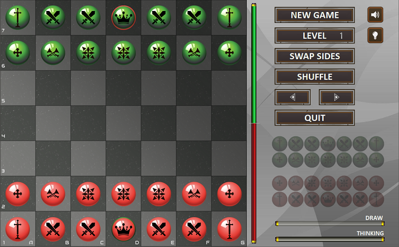 A classic board game with simple rules based on genetic algorithms, it allows an unimaginable number of combinations and strategies. Different levels of difficulty are available. At any moment, a position can be shuffled randomly to get an original position on the board.