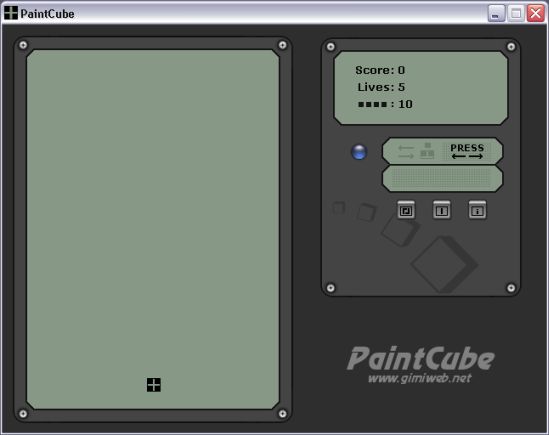 PaintCube is a game based on observation, speed and wit. The player is tasked with avoiding falling cubes, which he draws himself by moving the slider. The slider can move left and right, creating three rows of cubes. For each die the player avoids, 1 point is awarded. There are 10 charges for the worse times when collision with the dice is inevitable. The player can also capture falling bonuses worth 50, 100 and 250 points, depending on the number of dice in the field. The top ten results are entered into a "Top Ten Players" table.