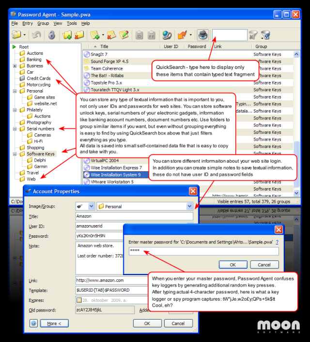 Password Agent is a clear password manager that allows you to store all your passwords, secret notes and data in a single secure database. It stores all kinds of textual information. Thus, the program keeps track of all your passwords and other information. All this data is encrypted and a master password is required to access it. It can work directly from a portable disk or USB flash drive.