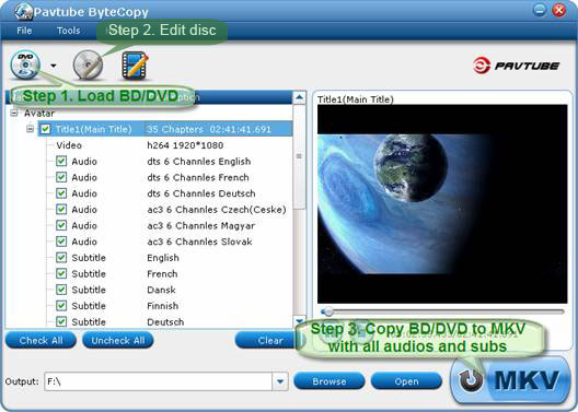 Pavtube ByteCopy is the best tool for ripping and converting commercial Blu-ray movies and DVDs to MKV format with multiple audio tracks and subtitles. In addition to preserving multiple audio tracks (especially HD audios - Dolby TrueHD 7.1/5.1, DTS-HD Master Audio 7.1/5.1, Dolby Digital 5.1) and multiple subtitles in MKV video without transcoding.