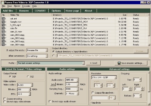 Pazera Free Video to 3GP Converter converts most used video files (format: AVI, DivX, XviD, MPEG, MPG, WMV, ASF, MOV, QT, FLV, SWF, MP4, M4V, 3GP, 3G2, MKV, VOB, DAT) to 3GP or 3G2 format for mobile phones. It allows you to convert whole videos or only selected parts and set output parameters.