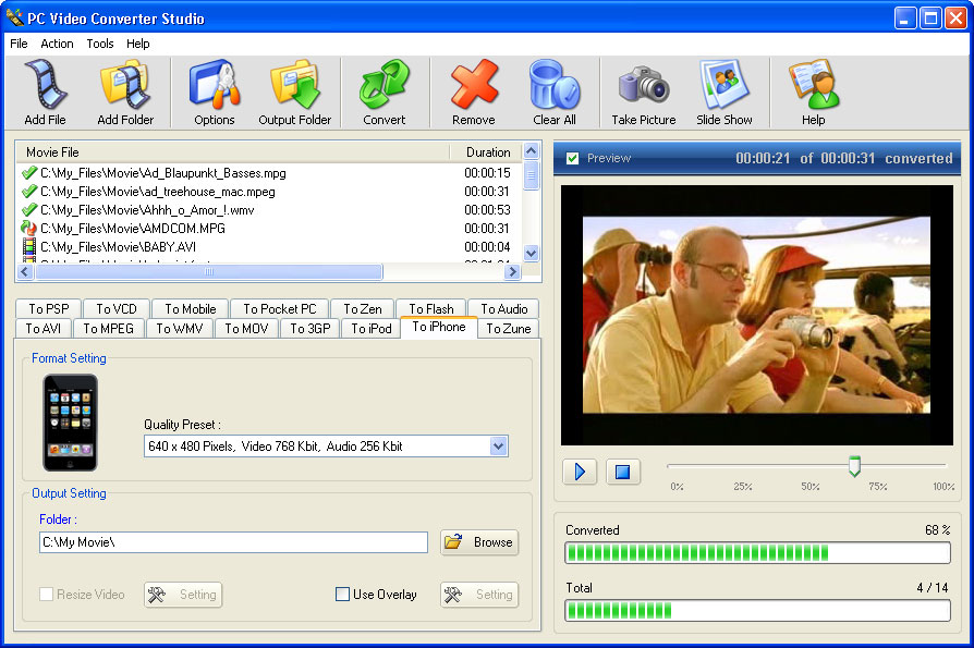 PComputer Video Converter Studio was designed to convert the most commonly used video formats: AVI, DivX, XviD, MPEG1, MPEG2, VCD, SVCD, DVD, WMV, ASF, MOV, RM, RMVB, 3GP, 3G2, FLV, MKV, iPod, iPhone, Zune, PSP, Mobile, Pocket PC, Zen, Flash video, M4V and MP4.