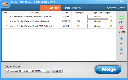 PDF Splitter & Merger offers two ways to merge. You can merge all imported PDF files into one or merge selected pages even from different PDF files into one PDF. You can also split in different ways according to the rules you set. The program can also handle password-protected PDF files.
