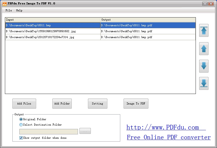 PDFdu Free Image to PDF is a fast and easy-to-use tool that is designed for batch conversion of image files to PDF document. Just add image files to the list and click the "Convert" button. The supported formats are BMP, DIB, GIF, JPEG, JPG, JPE, JFIF, PNG, TIFF. You can set the page size, watermark and limitations in PDF etc. PDFdu Free Image to PDF Converter is a standalone software, so Adobe Acrobat Reader is not required.