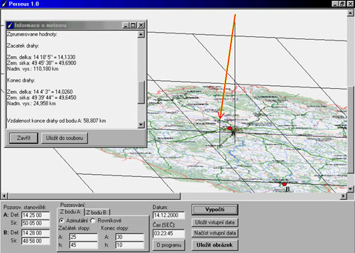 The user enters the geographical coordinates of the observation sites? and the azimuthal or equatorial coordinates of the observed start and end of the meteor track. The program calculates the path of the meteor in the atmosphere and plots it on a perspective map of the Czech Republic. At the same time, it will print the calculated data into a text window. These are: