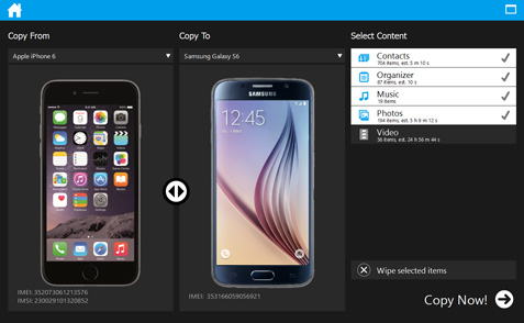 Phone Copier Express is a software solution for copying phone content quickly, from one phone to another of any brand (Apple, Asus, Blackberry, Dell, Ericsson, Google, Siemens, HP, Huawei, Motorola, Nokia, Panasonic, Samsung) regardless of platform (Android, Blackberry, Windows Phone, Apple iOS, Symbian, Bada and others). The tool guarantees fast transfer times, simple user interface and also provides statistical information about your customers' transfers.