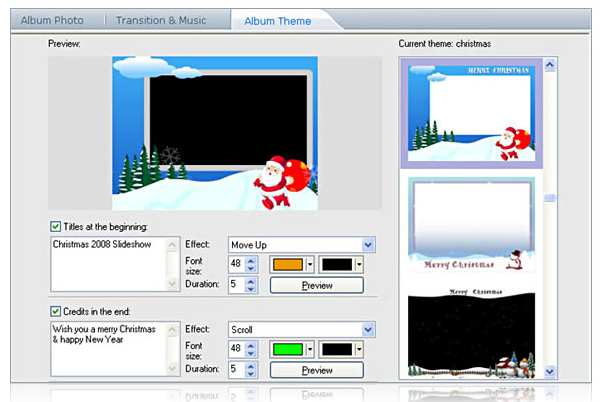 You can add music to your custom slide show to play in the background, design your own DVD menus, and arrange your images into multiple albums. You can also set different transitions between images, the time each image is displayed, and add text captions.