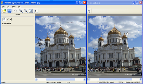 Photo Image Inpainter allows you to retouch and remove unwanted objects from your digital photos. The program supports a large number of raster graphic file formats,including JPEG/JPEG200 , BMP , GIF, TIFF , PNG, PCX , TGA , PPM , PBM , PGM.