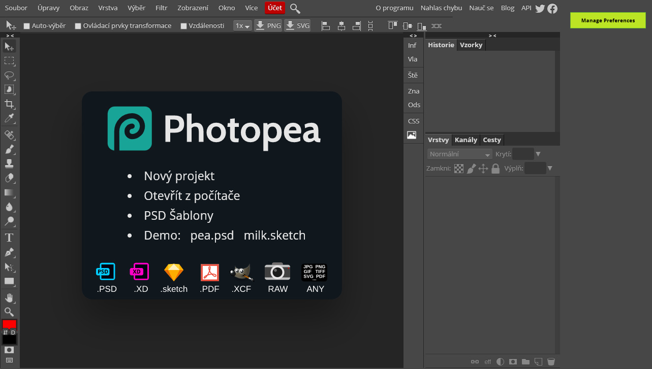 Page Photopea...Photopea is a free online graphic editor with an environment as similar as possible to Adobe Photoshop, it is controlled completely via a web browser and there is no need to install anything on your PC. It includes all the familiar features such as layers, filters, magic wand selection, etc. It supports formats from Adobe Photoshop i.e. .PSD, but also .XCF from GIMP, .Sketch from Sketch App, .XD from Adobe XD and .CDR from CorelDRAW software. From 2020 it also supports .FIG files from WinFIG, .RAW and .TGA images.