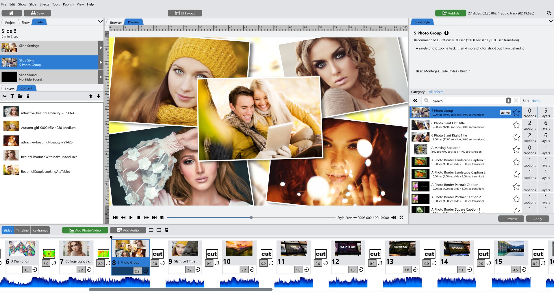 Create a video presentation using the automatic presentation wizard or create one from scratch. Choose from 950+ built-in effects and filters. When you're ready to share your work, publish it to any of 50+ popular formats such as HD, 4K, DVD, Blu-ray, YouTube, Facebook and more.
