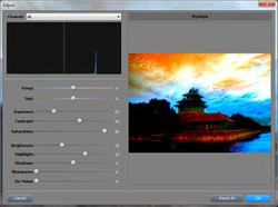 PhotoSun 14 gives you the ability to zoom in or out, rotate or flip images, set the current photo as wallpaper, resize and crop items, as well as create full-screen slideshows with background music, theme and user-defined delay transitions. Other features include red-eye reduction, adjusting exposure, contrast, saturation and brightness levels, applying a random noise filter and sharpening. Edited photos can be printed, saved to a file, emailed or saved to Facebook.