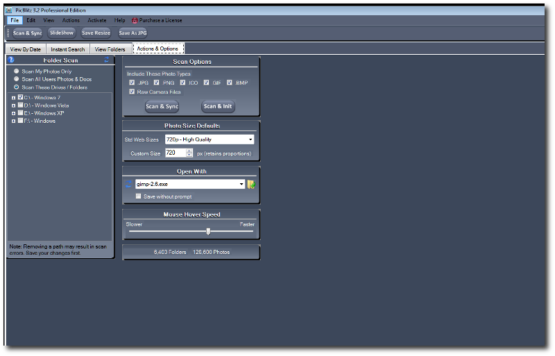 PicBlitz is a very fast viewer of digital photos, just hover your mouse over a folder or file and the image is instantly displayed. It supports full screen photo presentation and supports JPG, PNG, GIF, BMP, ICON, and also ARW, CR2, CRW, DNG, MRW, NEF, NRW, ORF, PER, RW2 and X3F. It also offers several editing functions: rotate, change resolution, adjust brightness, contrast, color. Photos can be easily searched by name or date and organized clearly.