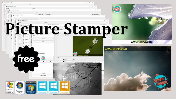 Picture Stamper is an application that provides basic editing of digital photos and images. You can apply a logo or watermark, resize images (pixel dimensions), add shadows, perform compression (reduce file size - JPEG only).