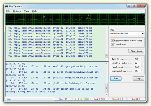 Ping Terminal uses the classic ping technique (information about the response time and integrity of the data sent) in a graphical representation of the response time.