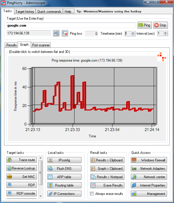 PingHurry is a graphical interface for executing the PING command, which detects the response rate of servers. There is a clear history of tested servers, evaluation in the form of 2D and 3D graphs and many other useful features.