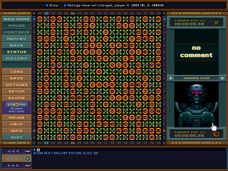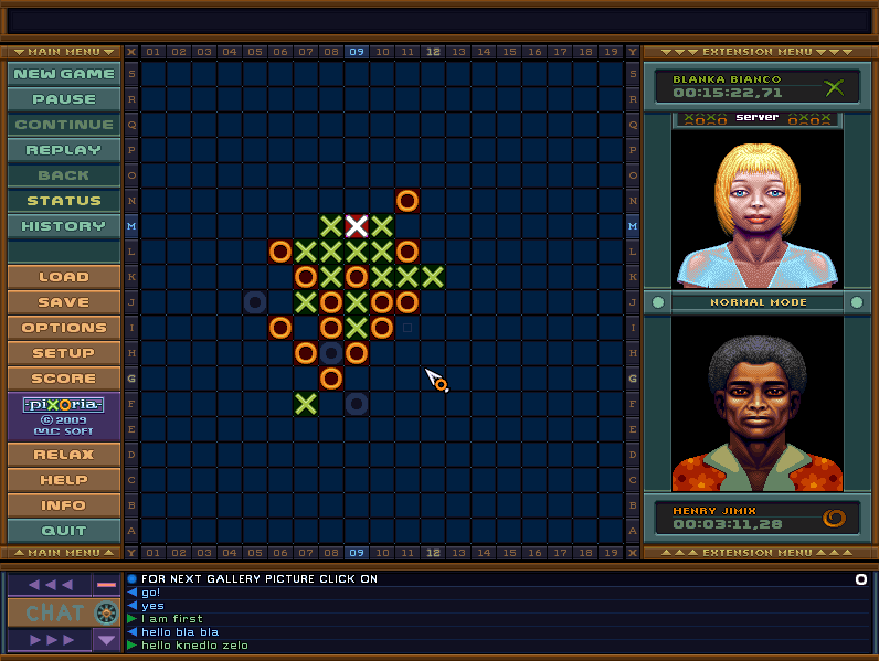 Pixoria is a classic gomoku game, but in a high-end processing and with the possibility to play over the Internet. The game environment allows easy integration of artificial intelligence plugins from independent developers.