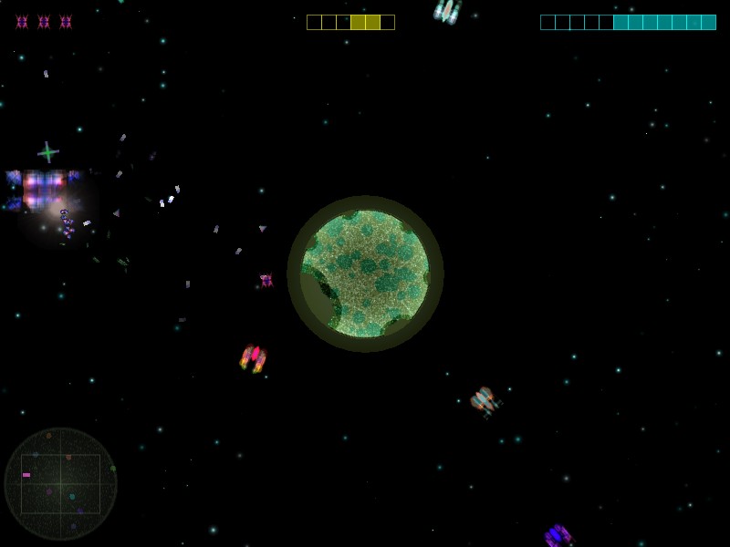 A remake of Planetary Defense from the osmibit computers, in which you shoot an artificial satellite orbiting the planet you must protect. Enemies fly in from all sides on a collision course with the planet, and in later levels there are cruisers that bombard the planet. As the difficulty of the game increases in each level, the enemies become more numerous and faster, the planet smaller, and the cruisers bombard with greater cadence. You have three lives to start, and since there is no way to get more, you must try to last as long as possible and get as many points as possible, which are added to the top of the screen in a binary counter. The game will generate an image when you're done, where you can read the points you've accumulated in decimal. You gain points for destroying enemies and hitting cruisers, and lose points for destroying the planet you are supposed to protect.