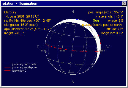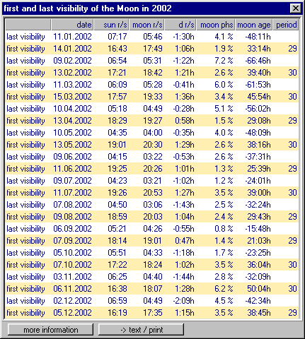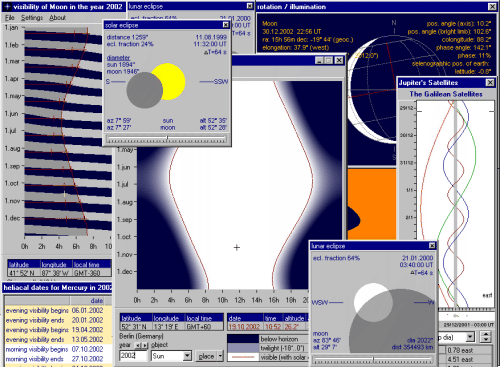 The program provides a lot of other information such as planet magnitudes, moon phases, solar and lunar eclipses, positions of Jupiter's moons, etc.