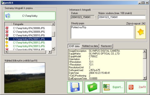 This program is designed to further edit your PhotoMerge photos. It displays a preview of the photo from the selected directory and allows you to write a description of the photo and then export it to MS Excel.
