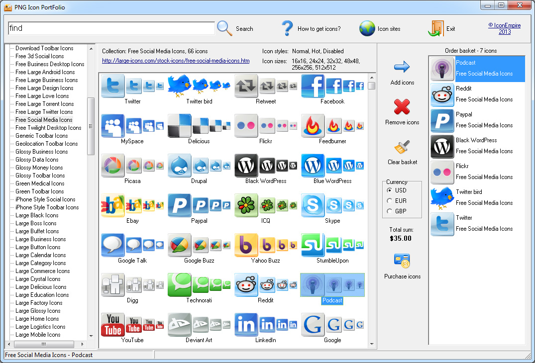 PNG Icon Portfolio lets you browse thousands of icons with ease and comfort. You can browse tons of libraries and download the images you need to create your GUI portfolio. Images in PNG, ICO, GIF and BMP formats are included in the portfolio. Icon sizes range from 16x16 to 256x256 pixels.