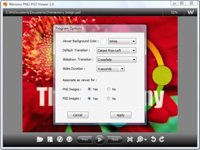 PNG PSD Viewer is a simple application designed for web and graphic designers, with which you can open files in PSD and PNG format. In addition to displaying the images, it also allows you to open the entire gallery located in a specific directory and use the directional buttons to navigate between images.