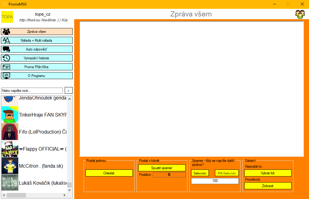 PnonaMSG(formerly PnonaSkype) is a tool that makes it easier for you to communicate via Skype client. It has features:Message to All (With Spammer),Mood, Multi Mood, Auto Reply, Delete History and Single Person Spammer. Newly supports Pnon Wishlist..