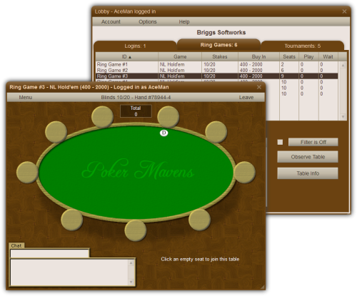 Poker Mavens is an affordable software system that allows anyone to run their own Texas Hold'em and Omaha poker room. The server module installs on any regular Windows computer (or Windows Server) and acts as a simple web server. Players then connect to the poker server with any modern HTML5 web browser. Flash or other plugins are not needed.