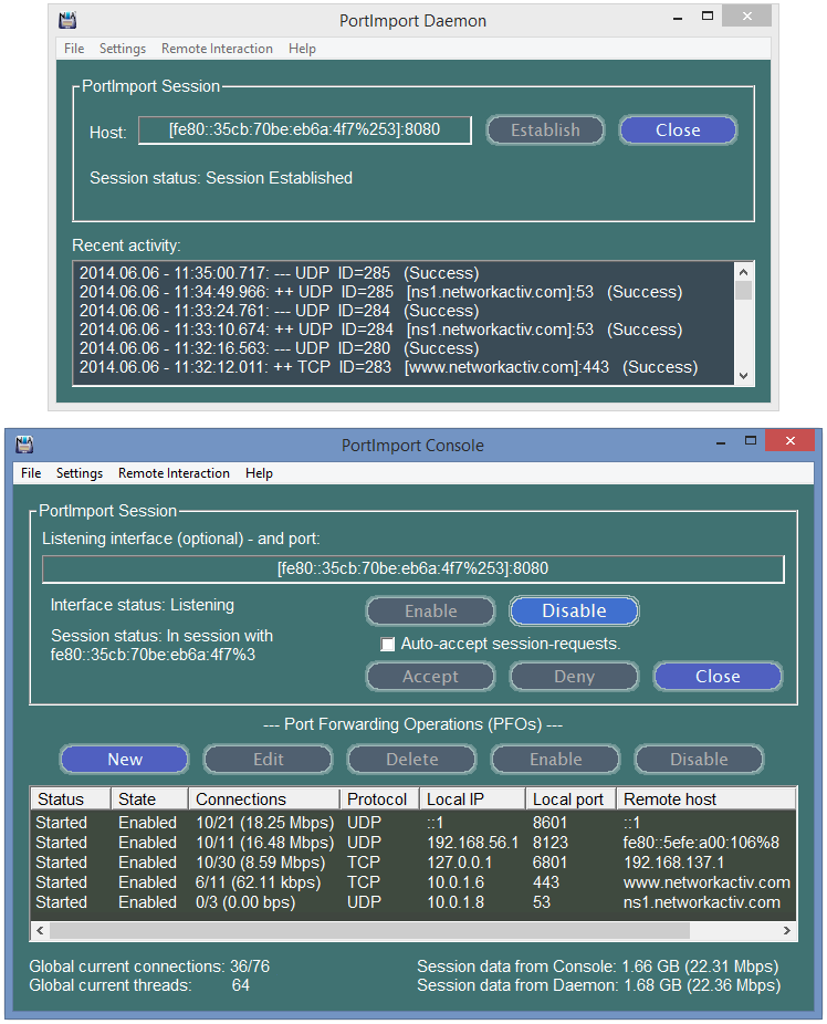 PortImport provides remote port reverse forwarding, also known as reverse port tunnelling. It supports both TCP and UDP ports and even multiple connections in addition to supporting simultaneous and harmonic streaming. This allows the client PC to remain in the safety of the firewall environment while you can use the IPv4 and IPv6 address ports. The application supports real-time logging and connection logging, makes do with a single TCP connection between the client and the console, and can be deployed as a Windows service.