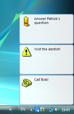 You can set any number of alarm repeats with custom message, sound, color, fonts, icons, etc. When an alarm is triggered, a notification bubble appears next to the desktop clock for a few seconds.