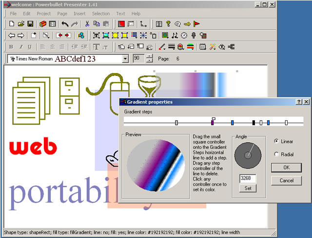 Powerbullet Presenter is an application for easy creation of flash animations for web pages. The ability to easily insert sounds (MP3, WAV), images (PNG, GIF, JPEG). The application has several animation effects that allow you to make the text move. Other features include support for hyperlinks and an integrated voice recorder. The finished presentation is exported to HTML or saved as a separately executable .exe file.