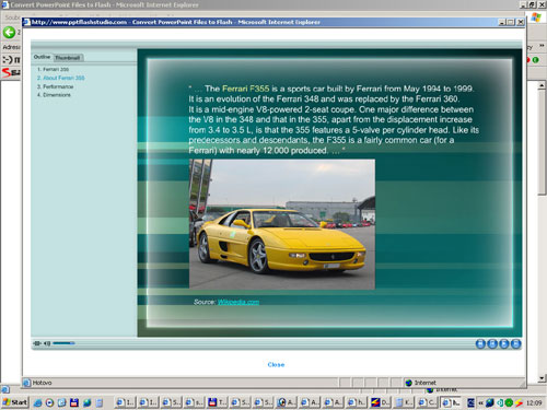 PPT To Flash Studio lets you convert PowerPoint presentations to Flash format, including all effects and sounds. You can choose between two different viewer styles. You can add transition effects to your presentation, insert the author's signature or company logo if the original format did not already include it. You can also add additional objects and voice accompaniment using the Flash editor. With the Flash editor, you can create interactive questionnaires that require a response or user intervention. The resulting product can be published as a .swf file or an executable EXE file. These files can then be uploaded to an FTP server, or burned to a DVD/CD with an editable splash screen. With this application, you will not need any additional program to run the presentation.