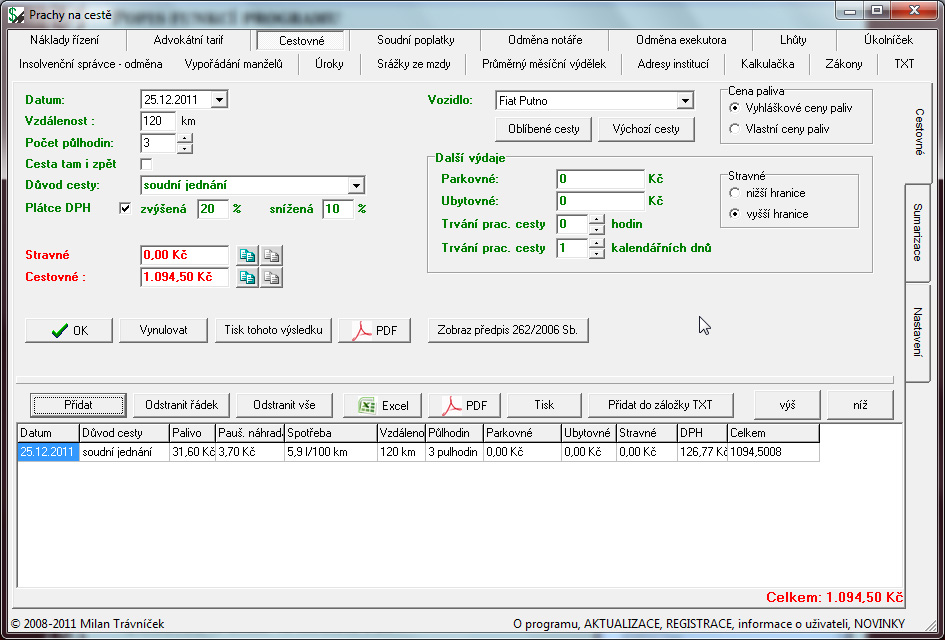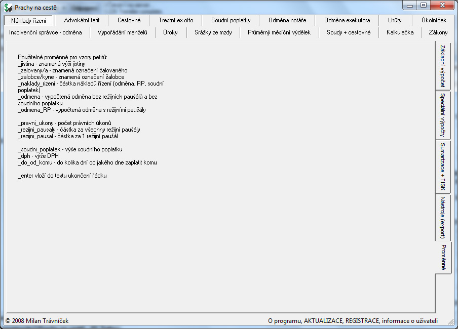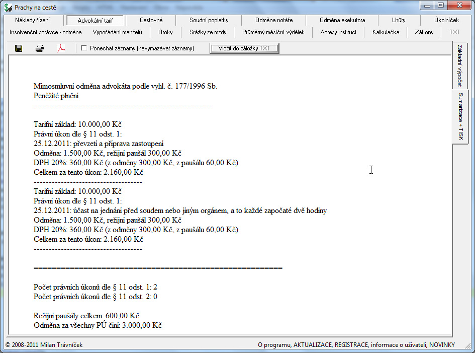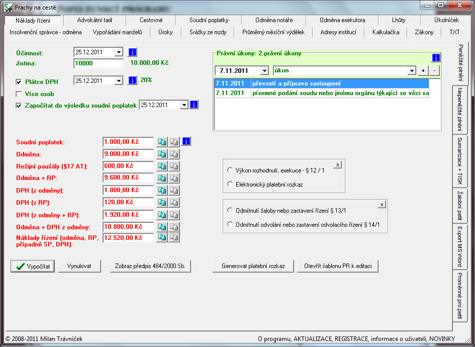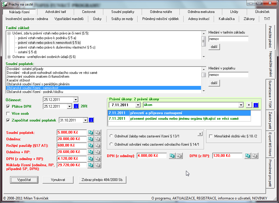 This legal calculator calculates the fee for legal services, so it can calculate the lawyer's fee according to Decree No. 484/2000 Coll., the lawyer's tariff, court fees, etc.