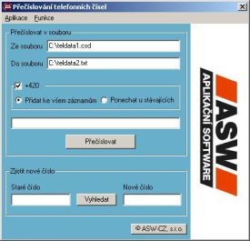 The program is used to quickly and securely convert phone numbers stored in files on your computer's hard drive. It searches the specified file and converts the found phone numbers that meet the renumbering condition into a new form. The program can convert mobile operator numbers and Czech Telecom numbers (landlines).