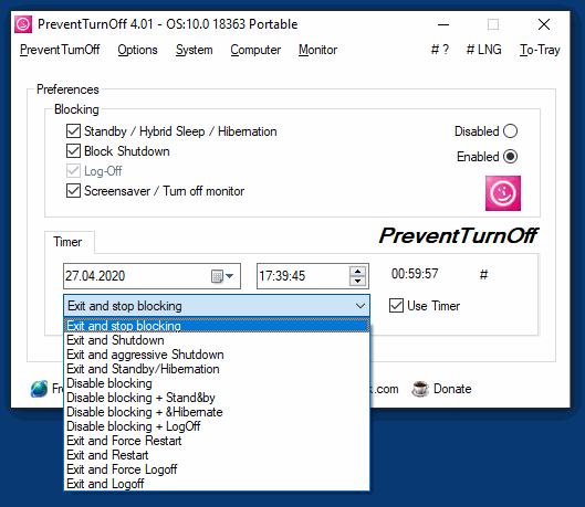 PreventTurnOff is a simple utility that allows you to block your computer from going to sleep and keeps it in standby mode at all times. You can easily disable going to sleep mode, hybrid mode or screensaver from the menu. It can also be set to shut down your computer at a specific time. In addition to this, it also allows quick access to power settings via a link.