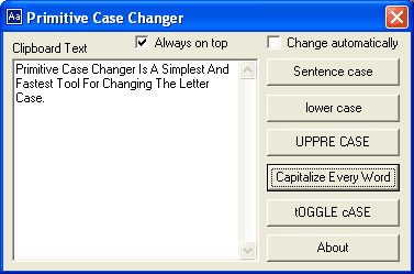 Primitive Case Changer is a small tool that offers the fastest and most convenient way to resize letters. The program will automatically change the text according to the selected setting. Operation is easy.