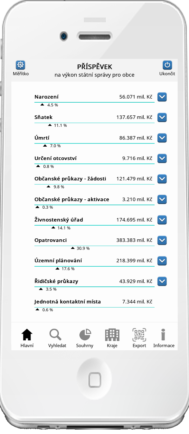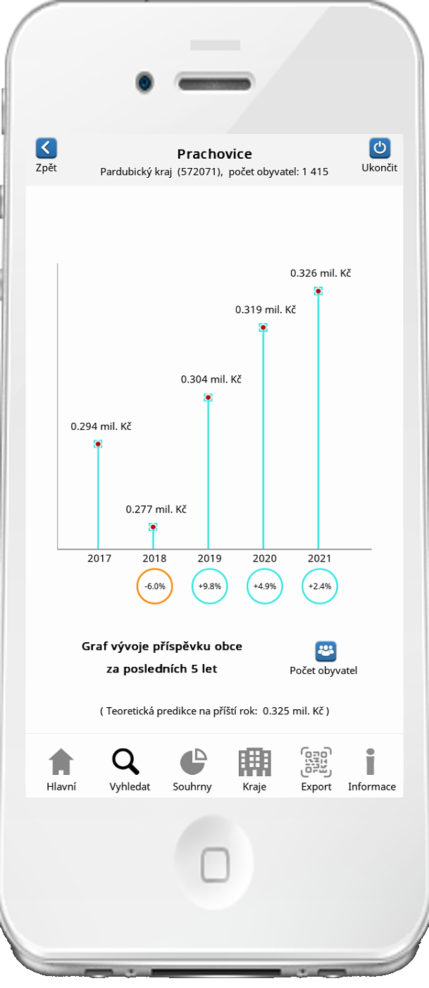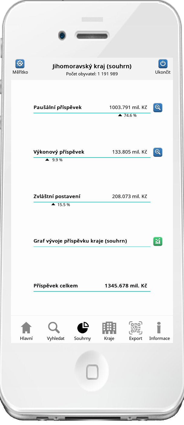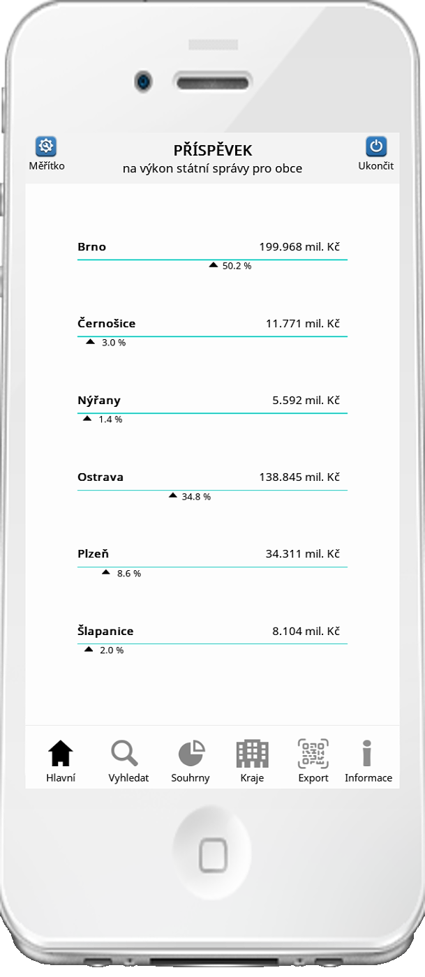 Page Příspěvek obce 1.0.6...The application allows any user to get a transparent overview of the financial contributions for individual municipalities and cities, which they receive annually from the state as part of the state budget, from open data.