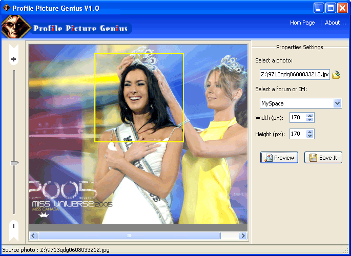 Profile Picture Genius is a handy application for cropping and resizing images or photos, allowing you to easily create a custom profile avatar for your favorite social forum or instant messenger tool (e.g. MySpace, MSN, Skype, Flickr, YouTube, Blogger, phpBB forum vBulletin forum IPB Forum).