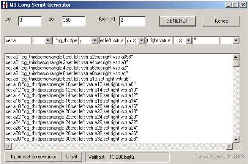 With this tool, you can quickly and easily create long scripts for Quake 3 Arena, such as a camera rotation script where each rotation requires a definition that references the next or previous string. In Q3LSG you can specify how many steps (in this case degrees) to advance. So you can easily make a script to rotate the camera one step at a time. However, such a script might be too long for Quake3, so you have to split it into several parts and then implement them sequentially in Quake.