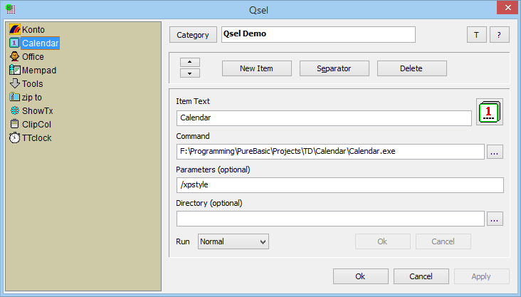Qsel is a "launcher" for frequently used programs, documents and web links. The program makes it easy to launch applications, documents, web pages and batch files using icons. It is possible to use large and small icons and categorize them.