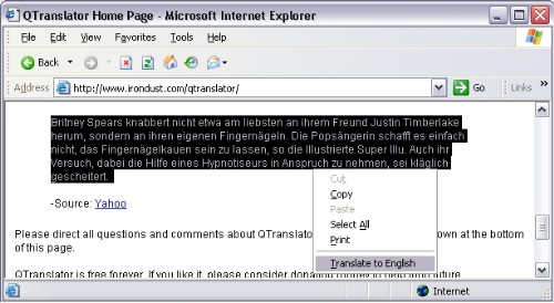 QTranslator is a useful utility that allows Windows Internet Explorer users to highlight text in a foreign language and easily translate it into English (using the right mouse button via the context menu).